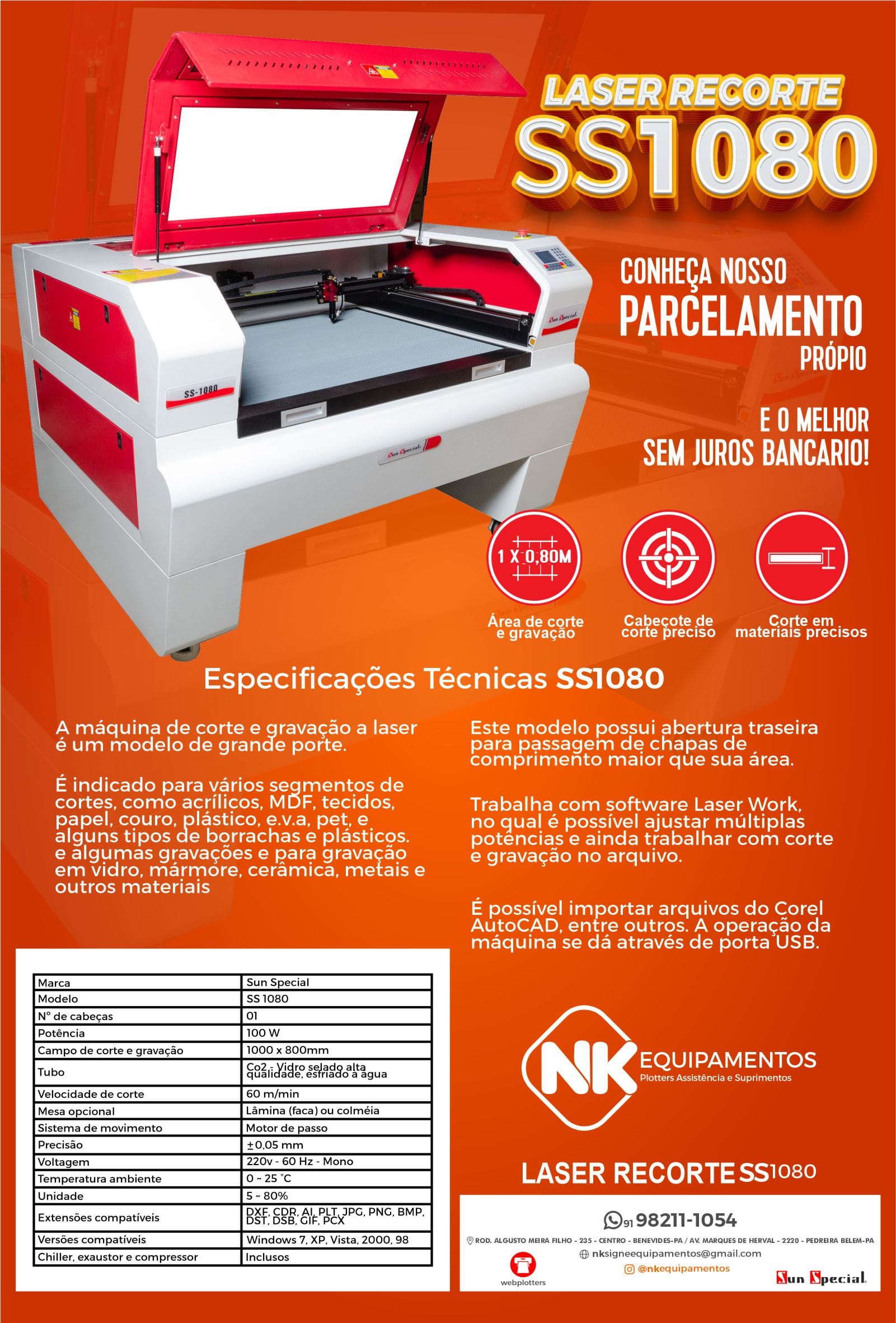 Trabalha com software Laser Work no qual é possível ajustar múltiplas potências e ainda trabalhar com corte e gravação no arquivo.